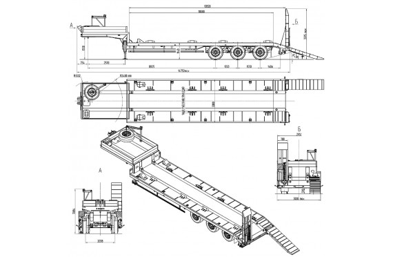41200 кг, шины 395/85R20 или 445/65R22,5 / 6+1, платформа 9280 (10142 до трапов) x 2530 с уширителями до 3030 мм, ССУ 1550 мм, рессорная или пневматическая подвеска, раздвижные коники