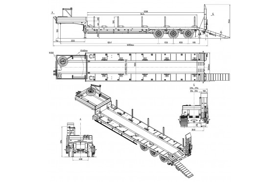 40500 кг, шины 395/85R20 или 445/65R22,5 / 6+1, платформа 10000 (10865 до трапов) x 2530 с уширителями до 3030 мм, ССУ 1510 мм, рессорная или пневматическая подвеска, съемные стойки, передний щит
