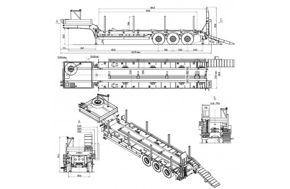 45200 кг, шины 395/85R20 или 445/65R22,5 / 6+1, платформа 12000 (12862 до трапов) x 2530 с уширителями до 3030 мм, ССУ 1550 мм, рессорная или пневматическая подвеска, съемные стойки, механические трапы с пружиной