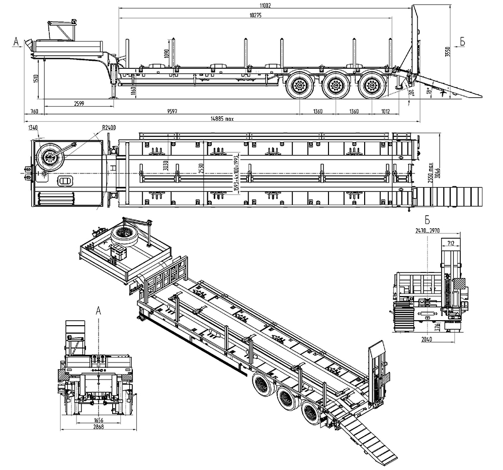29800 кг, шины 385/65R22,5/6+1, платформа 11474 (12200 до трапов) x 3000 мм, ССУ 1550 мм, рессорная или пневматическая подвеска, съемные стойки