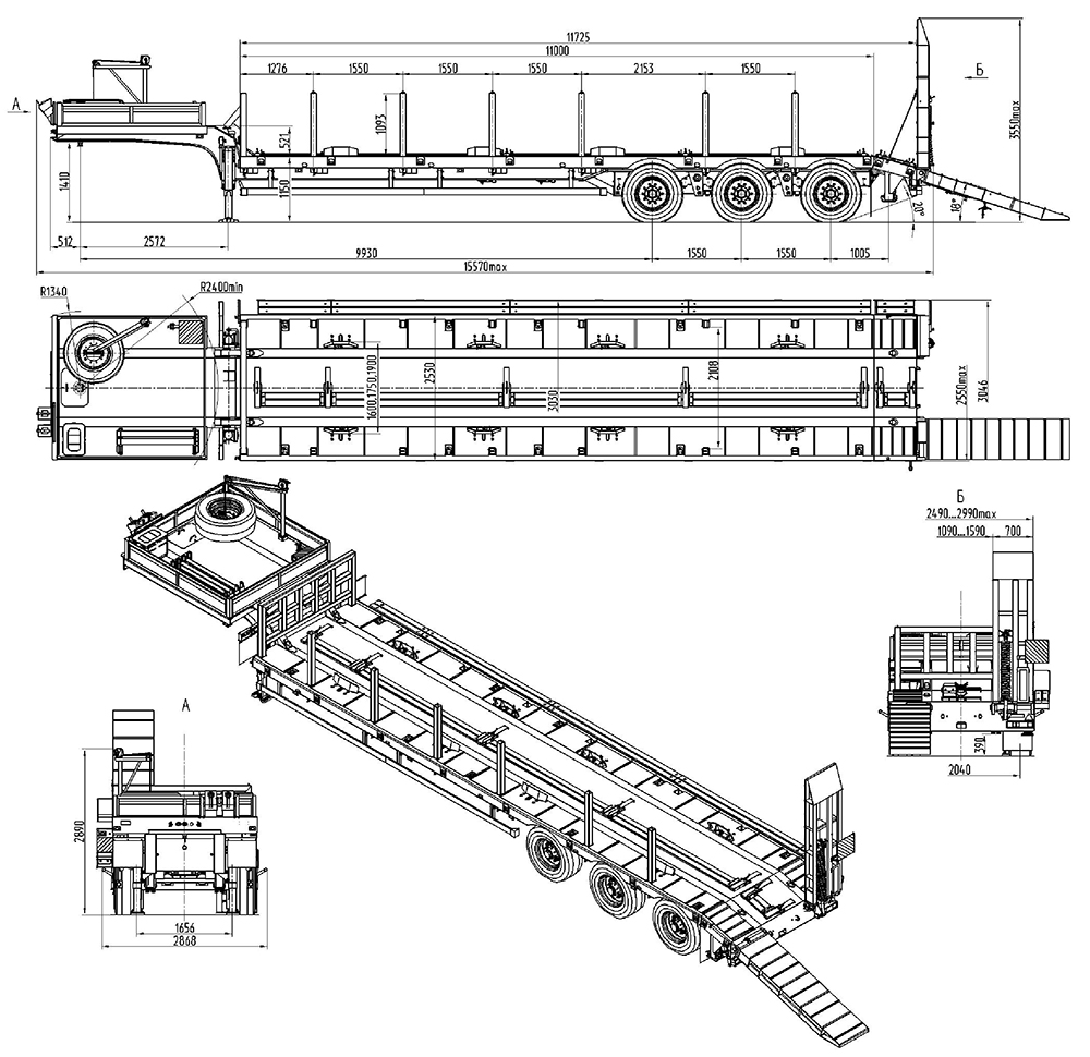 29800 кг, шины 385/65R22,5/6+1, платформа 11474 (12200 до трапов) x 3000 мм, ССУ 1550 мм, рессорная или пневматическая подвеска, съемные стойки
