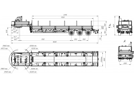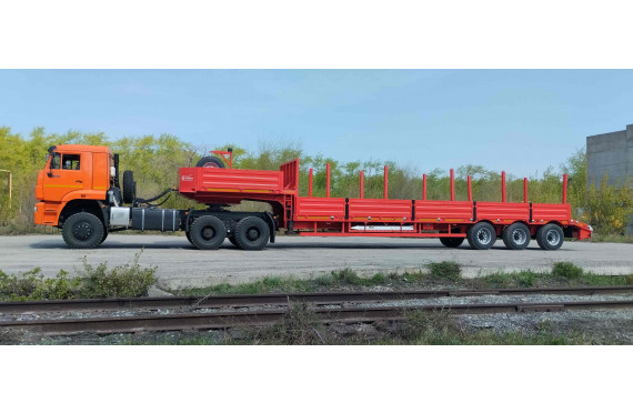 36000 кг, шины 385/65R22,5 или 445/65R22,5/ 6+1, платформа без трапов (12000 x 2500 мм, ССУ 1430 мм, пневматическая подвеска, раздвижные коники 1500 мм, съемные борта или без них, в ГАБАРИТЕ по ДЛИНЕ АВТОПОЕЗДА с КАМАЗ 6x6